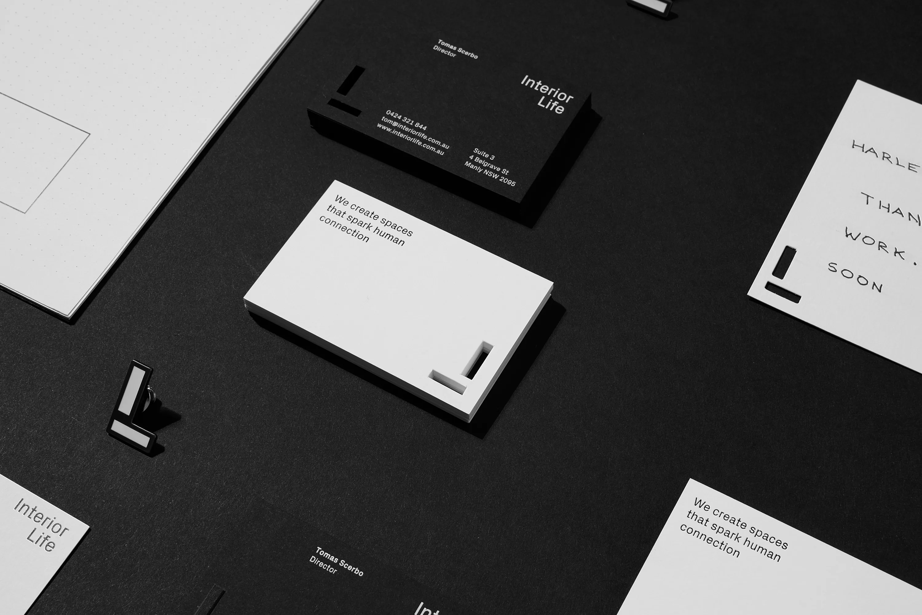 Interior Life are a passionate group of designers and architects who work mainly in immersive hospitality design. They approached Harley Johnston Design to refresh their brand. We started by interviewing Interior Life’s staff and clients. Beyond offering original authentic design and quality service the theme of creating real human connections came through as the end result of the work that Interior Life delivers. This idea of connection runs through the brand identity in the form of an underlying grid, made of 5mm square units that gives structure to layouts and spacing. The square grid led to the use of the distinctive typeface featuring right angled sections which also relates back to floorplans.